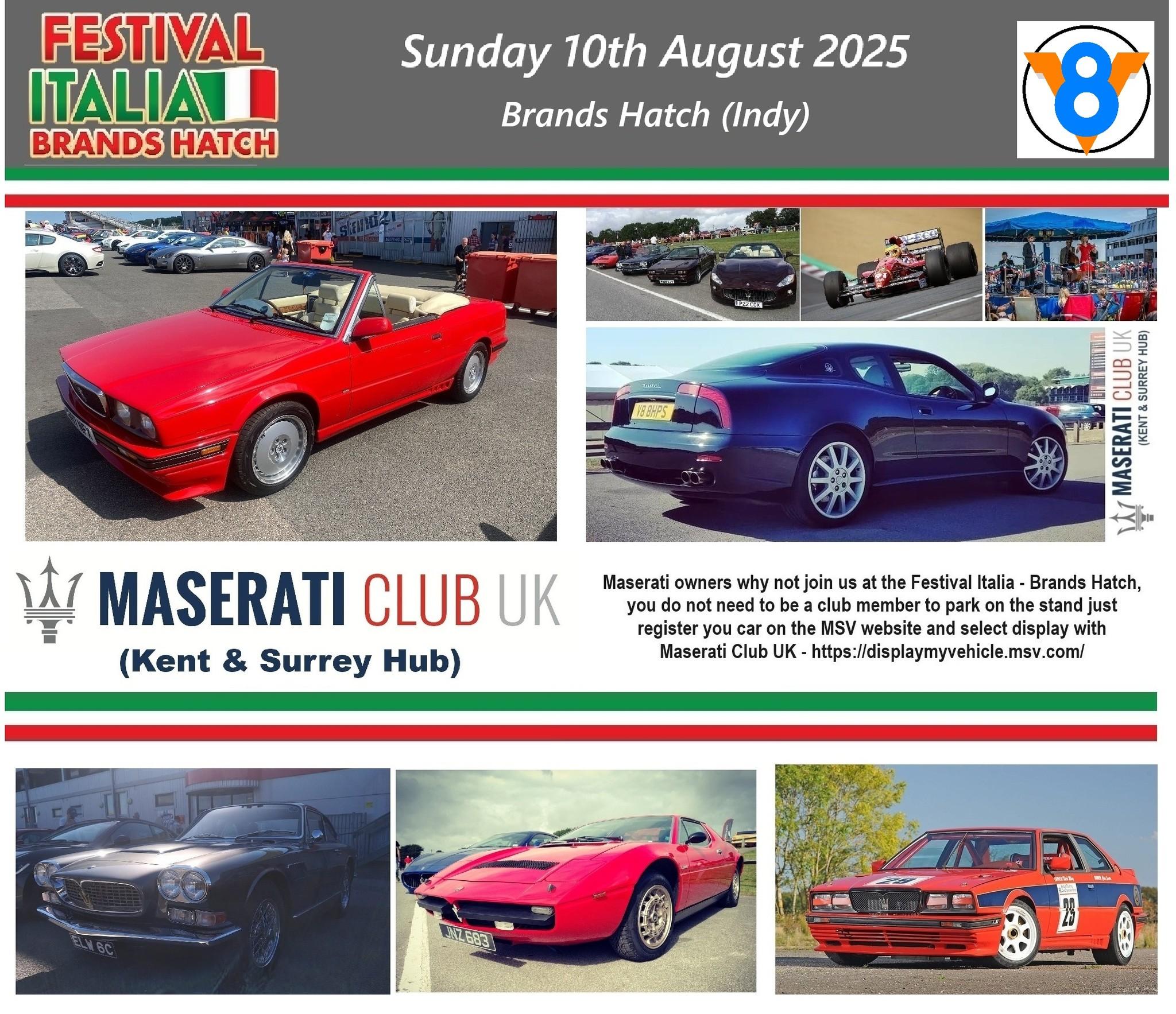 Festival Italia at Brands Hatch Sunday 10 August 2025A slice of La Dolce Vita returns to Brands Hatch in 2025 with Festival Italia once again celebrating Italian automotive culture.The finest examples of Italian excellence will appear on-track, with several famous marques represented. Special motorsport demonstrations are expected to appear too, with other iconic examples of Italian motorsport taking part.Off-track activities will transport attendees to the Mediterranean with hundreds of stunning Italian road cars, sports cars and supercars, including Ferraris, Lamborghinis, Maseratis, Alfa Romeos and more. Mouth-watering Italian cuisine, live music and much more will also feature.